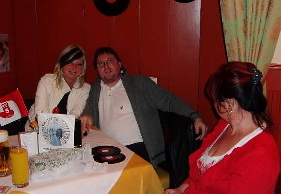Johann Anlanger hier mit seiner Maria aus Wien ist auch wieder extra für die Plattenkiste nach Salzburg gereist, rechts meine Gattin Grete, und "im Vordergrund" auf dem Tisch steht ein eigen produzierter Wimpel von Wilfried Faust (für den Plattenkiste Fanclub)