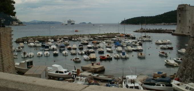 Da kommen wir zu einem guten Überblick über den alten Hafen. Draußen auf dem Meer liegt ein drittes Kreuzfahrtschiff vor Anker.